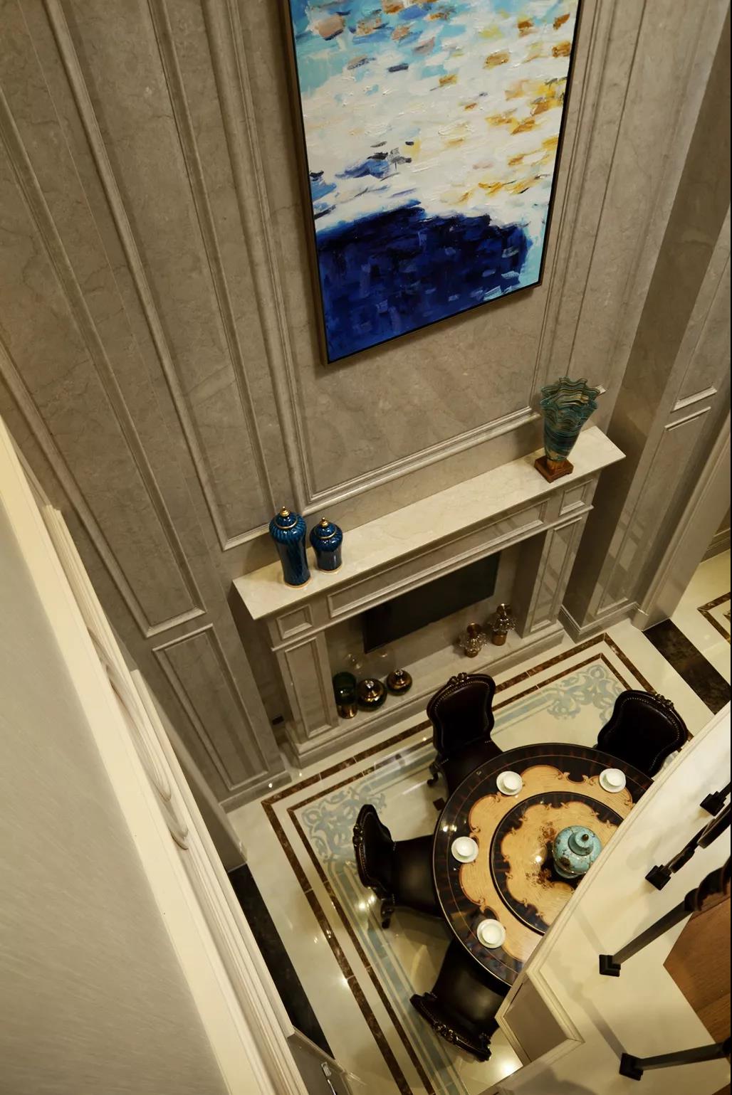餐廳則是用餐與家庭對話的場所,采用大理石挑空的背景,使空間感得以延伸,彰顯尊貴與大氣。