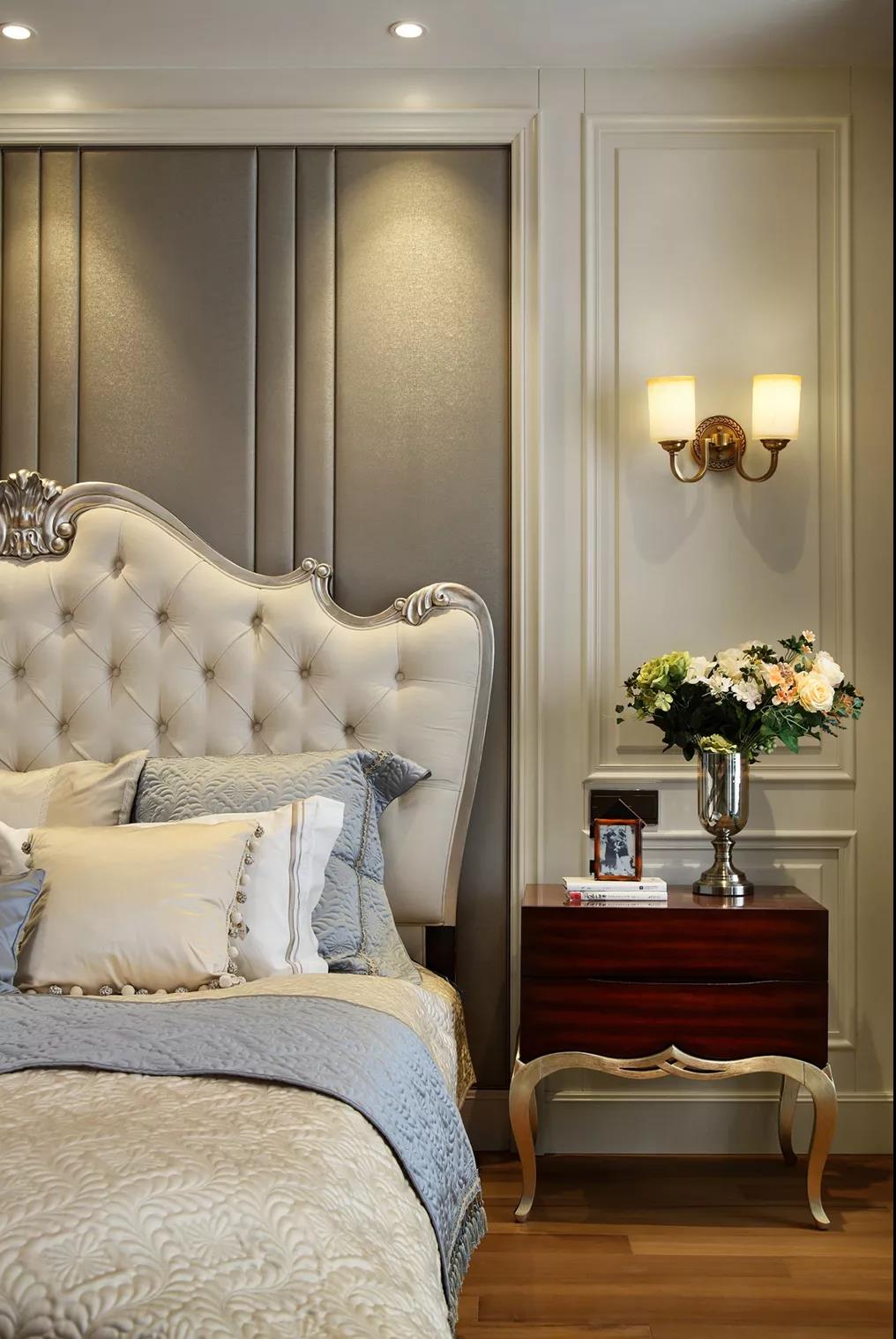 臥室是主人的私享空間。卡其色軟包與墻紙的搭配,讓整個空間看上去舒適而溫馨。