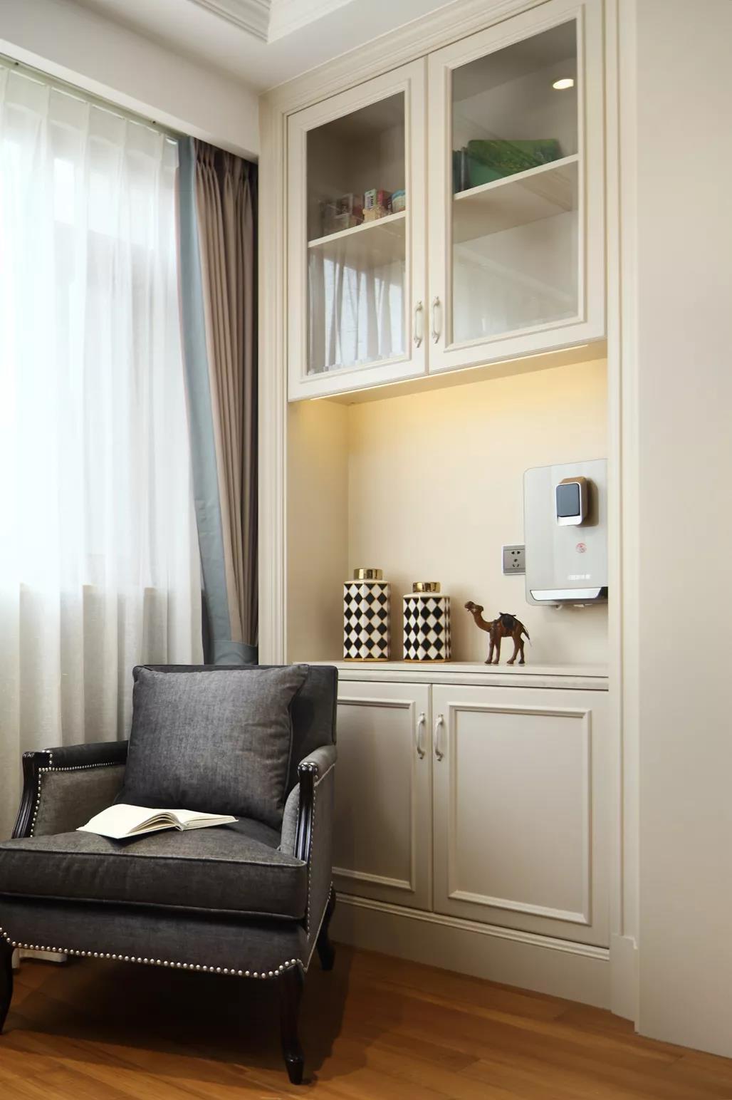灰藍色,平和又沉靜的調和色彩采用時尚大氣的暖灰色床靠背,與整個房間的色系靈活結合。