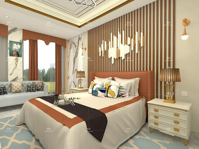 主臥背景使用了豎條的原木分隔排列,再搭配橫式金屬掛物點綴,整體看著和諧舒適,又頗具特色。