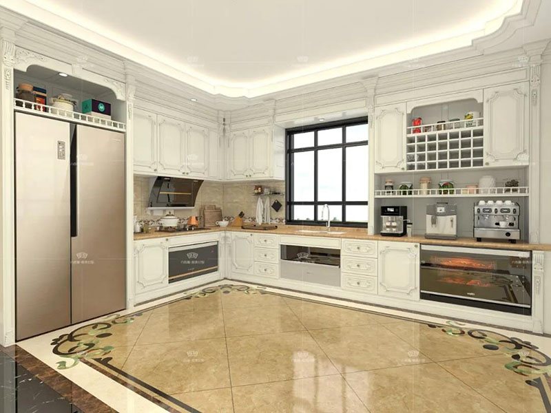 廚房分成了就餐區與制作區,就餐區使用了白色背景墻,搭配深色硬包,這樣吃飯的氛圍更加溫馨;廚房制作區因為空間足夠大, 同樣設計了多根羅馬柱,這樣使得廚房也有皇家范兒。